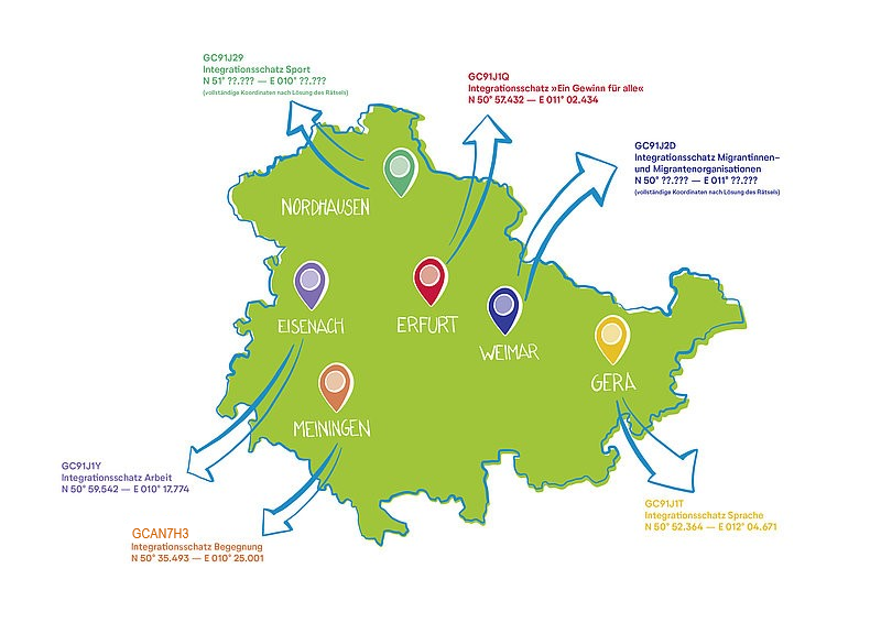 Die GeoTour „Thüringer Integrationsschätze“ besteht aus sechs Caches, die alle unter dem Motto „Integration in Thüringen – ein Gewinn für alle!“ stehen. Um diese Integrationsschätze bergen zu können, sind Kreativität und Einsatz gefragt. Die sechs einzelnen Caches können unabhängig voneinander gesucht werden. Reihenfolge und Zeitraum der Suche sind frei wählbar.
