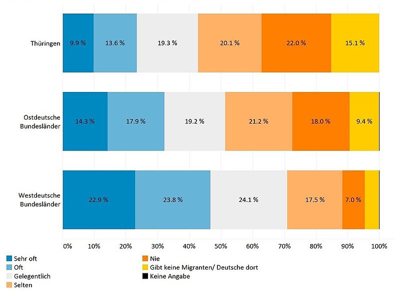 In Thüringen geben Menschen ohne Migrationsgeschichte im Vergleich zum Bundesdurchschnitt vergleichsweise selten an, Kontakt zu Menschen mit Migrationshintergrund im Freundes- und Bekanntenkreis zu haben (siehe Abbildung 4). Weniger als die Hälfte der Befragten (42 %) geben an, gelegentlich bis sehr oft solche Kontakte zu haben. Die anderen ca. 57 % haben nur selten oder nie Kontakt oder geben sogar an, es gebe keine Migrantinnen und Migranten (siehe Fußnote 1). Damit fällt der Kontakt aus der Wahrnehmung der Menschen ohne Migrationsgeschichte in Thüringen etwas geringer aus als in anderen ostdeutschen Bundesländern (48,8 % haben gelegentlich bis sehr oft Kontakt) und wesentlich geringer als in westdeutschen Bundesländern (70,8 % haben gelegentlich bis sehr oft Kontakt).
