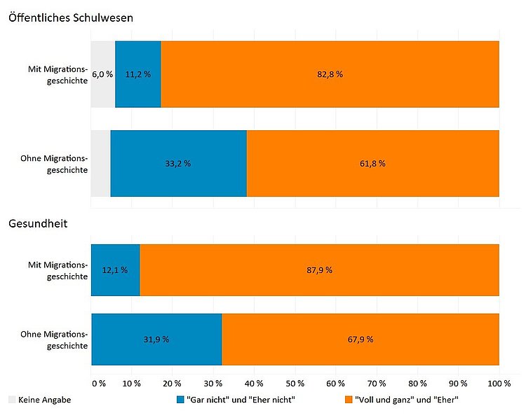 Beim Gesundheitssystem und beim öffentlichen Schulwesen (siehe Abbildung 8) fällt das Vertrauen beider Gruppen größer aus als beim Bundestag und der Bundesregierung. Auch die Unterschiede zwischen der Wahrnehmung von Menschen mit und ohne Migrationshintergrund sind hier etwas geringer, liegen aber dennoch noch bei rund 20 Prozentpunkten.
