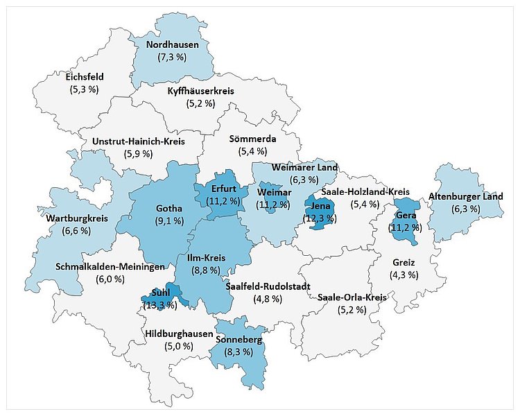 Die höchsten Anteile an Personen mit ausländischer Staatsangehörigkeit (über 10 Prozent) gibt es in den kreisfreien Städten Suhl, Jena und Gera und der Landeshauptstadt Erfurt. In Suhl, der bevölkerungsmäßig kleinsten der kreisfreien Städte Thüringens, befindet sich die größte Erstaufnahmeeinrichtung in Thüringen. Im gesamten Bundesland liegt der Anteil an Personen mit ausländischer Staatsangehörigkeit bei 7,6 Prozent, was deutlich unter dem bundesdeutschen Durchschnitt von 15 Prozent liegt.
