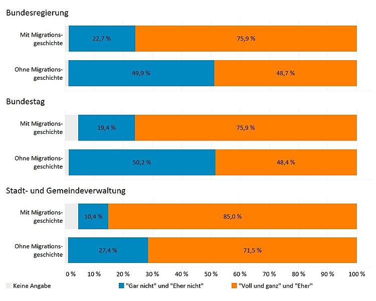 Besonders stark fällt dieser Unterschied beim Vertrauen in Bundestag (27,5 Prozentpunkte) und in die Bundesregierung (27,2 Prozentpunkte) aus (siehe Abbildung 6). 19,4 % der Bevölkerung mit und 50,2 % der Bevölkerung ohne Migrationshintergrund geben an, dem Bundestag eher oder gar nicht zu vertrauen. Bei der Bundesregierung geben 22,7 % der Personen mit Migrationshintergrund an, der Bundesregierung „eher nicht” oder „gar nicht” zu vertrauen. Unter Menschen ohne Migrationshintergrund sind es hingegen ebenfalls die Hälfte der Befragten (49,9 %), die der Regierung kein Vertrauen zusprechen. Dies spiegelt eine allgemeine Entwicklung in Deutschland wider, bei der im Kontext der Krisen der vergangenen Jahre (Pandemie, Krieg, Inflation) das Vertrauen in Politik und Institutionen gelitten hat (siehe Best et al. 2023). Kommunale politische Institutionen sind hingegen weniger stark von einem Vertrauensdefizit betroffen: Hier äußern nur 10,4 % der Bevölkerung mit und 27,4 % der Bevölkerung ohne Migrationshintergrund ihr Misstrauen.