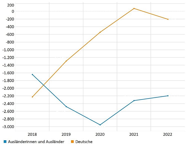 Im Verlauf der Jahre 2018 bis 2022 stieg der Wanderungssaldo für Personen mit deutscher Staatsbürgerschaft etwas an. Das Verhältnis zwischen Zu- und Fortzügen für Wanderungen zwischen Thüringen und den anderen Bundesländern war also bei Deutschen zuletzt ausgeglichener als in den Jahren zuvor. Für Personen mit ausländischer Staatsbürgerschaft fiel der Wanderungssaldo im Jahr 2020 negativ als in den Jahren zuvor und danach aus: Während des ersten Pandemiejahres zogen also mehr Ausländerinnen und Ausländer aus Thüringen in andere Bundesländer als umgekehrt.
